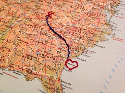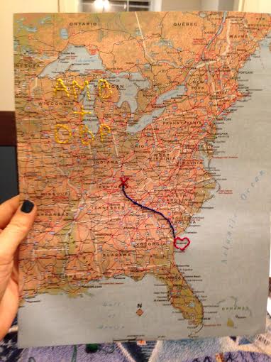 Recently, my brother and his girlfriend moved from Danville, KY to Savannah, GA. Lucky lil ducks, I say. I decided to do a little DIY brainstorming for ways to commemorate their big move with a crafty gift. I settled upon a project which ended up being a super easy afternoon endeavor that I’m sure anyone could replicate. Simply hand-stitch a map from point A to point B. Honestly, the toughest part about this craft was finding a suitable map. This would be a great way to remember a meaningful vacation, study-abroad trip or long distance trail hike and would look so sweet hanging amongst other frames on a mixed-media gallery wall.