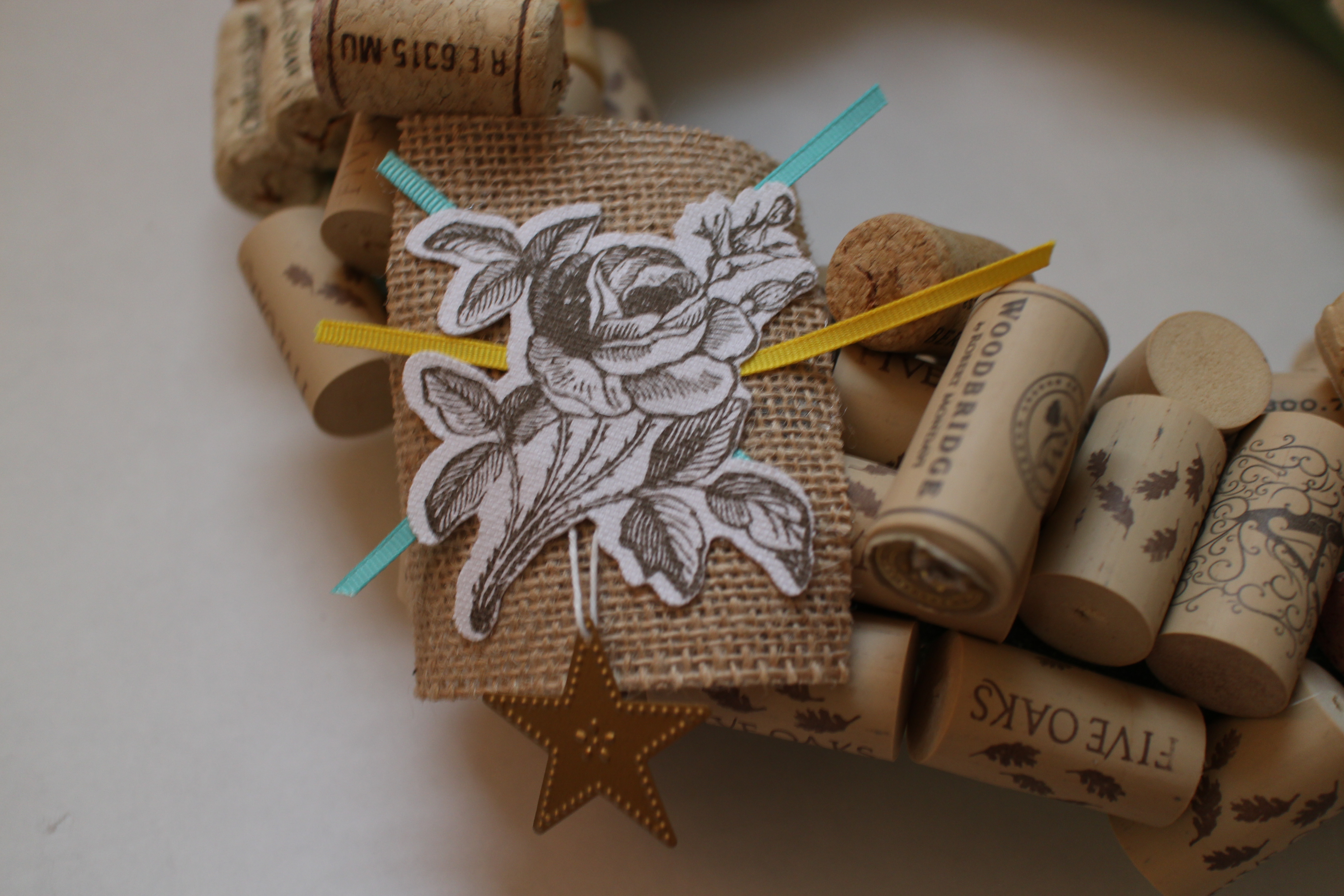 Once your wreath is completely covered in corks, you may want to add a little embellishment. I dove into my craft box to see what I had on hand and came up with some burlap, ribbon scraps, an old iron on transfer and a star charm. But you can use whatever strikes your fancy!