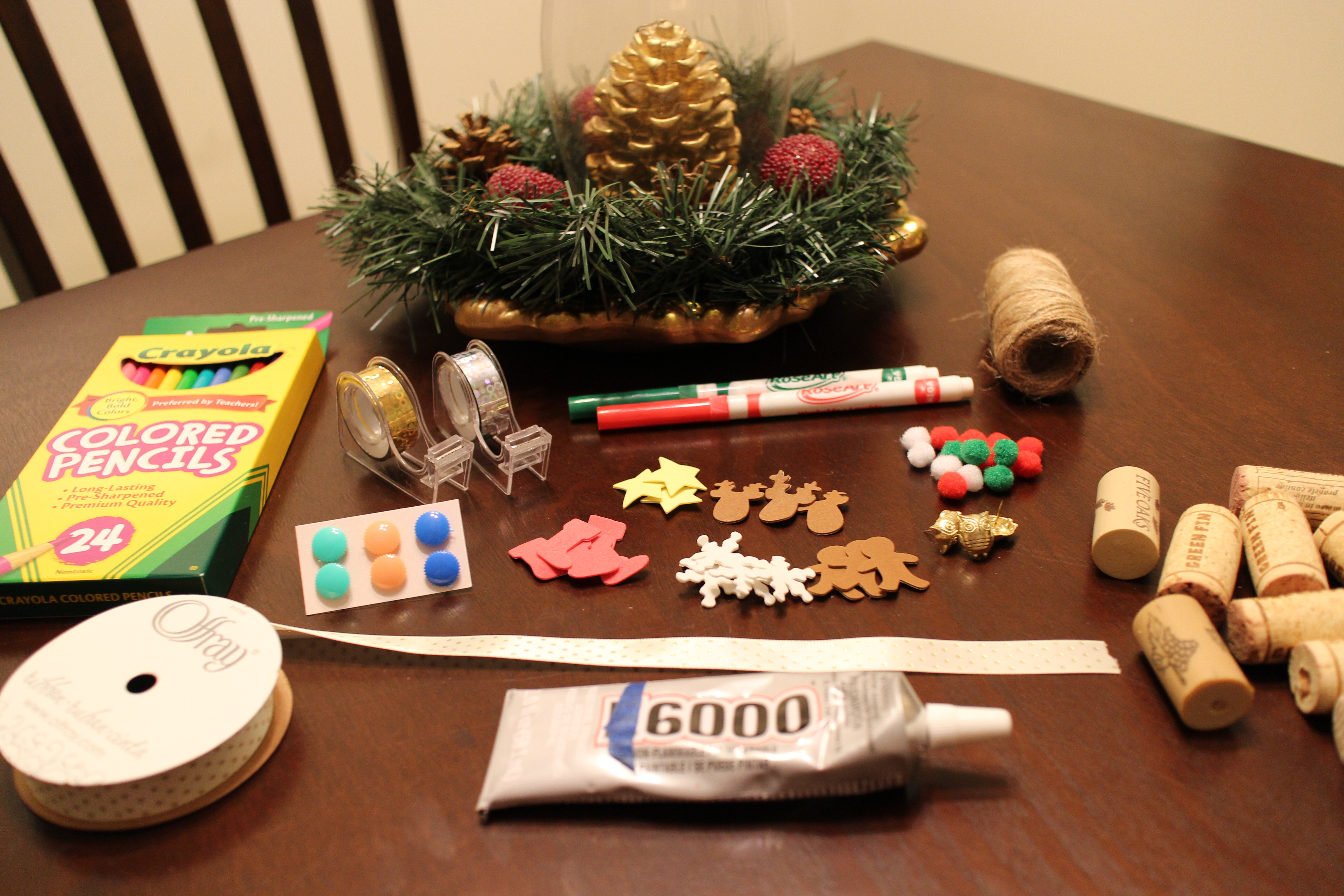 …and came up with these! Little pom poms and push pins make perfect “ornaments.” Twine can be used to turn your little trees into ornaments. And those foam stickers in the center were a Dollar Tree find (and the ones pictured are just a FRACTION of the amount that came in the bag). I used the E6000 glue to attach my embellishments but ended up using my trusty glue-gun to connect all the corks.