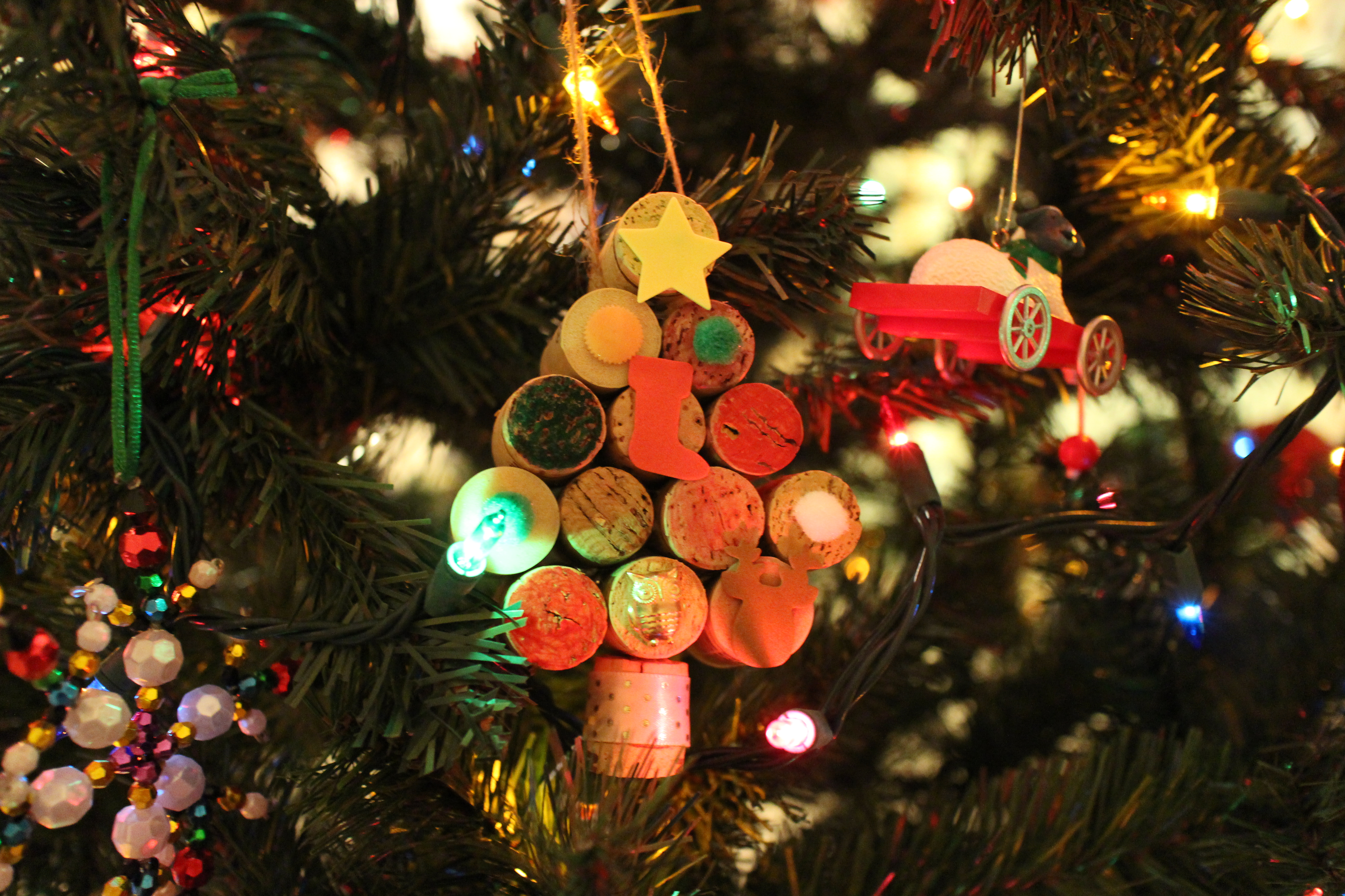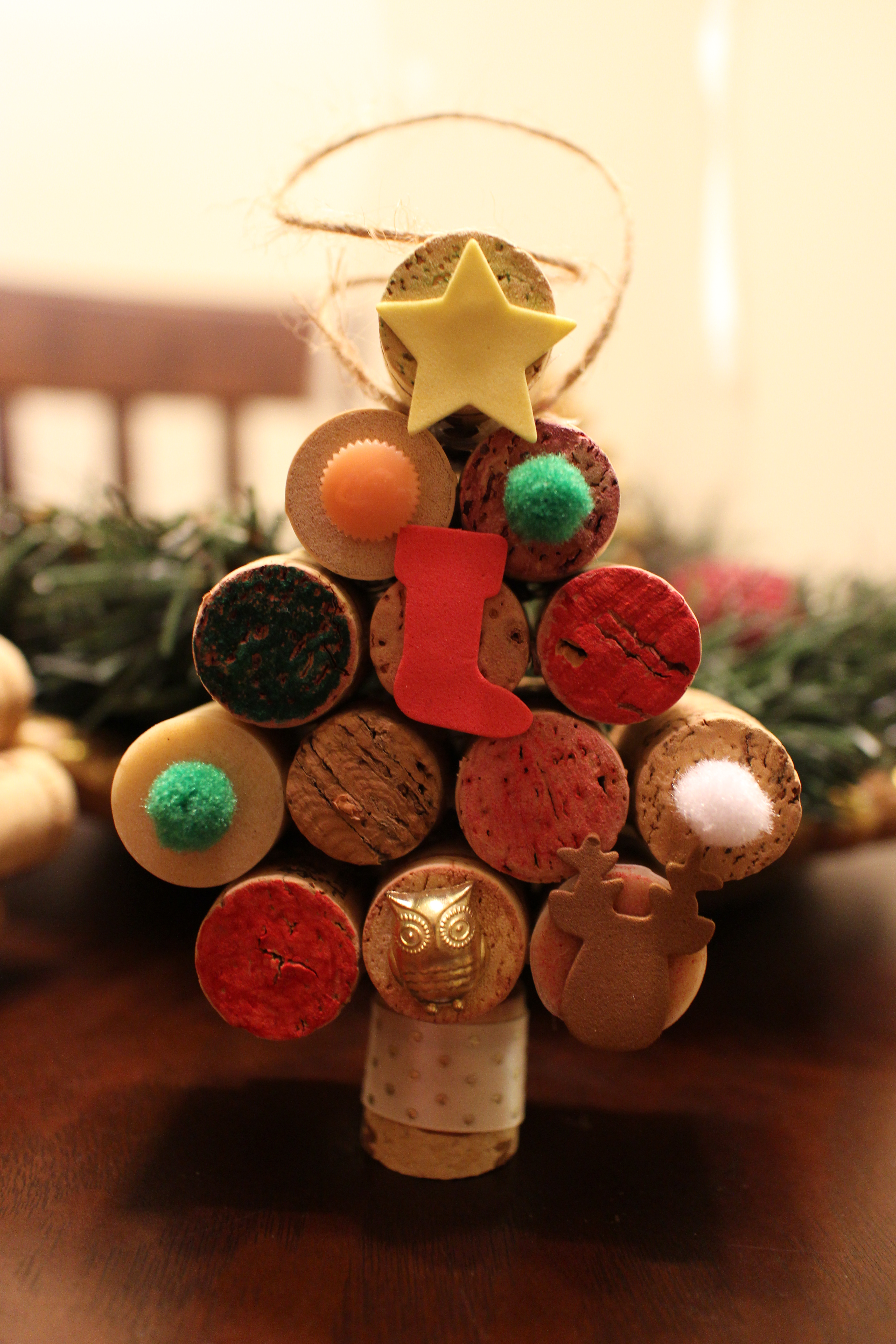 And I made another to hang on our tree. For this one I included a tree stump by cutting a cork in half (with a kitchen knife and a cutting board…livin’ dangerously!) and adding a bit of ribbon for embellishment. I also secured some twine below the top cork for hanging purposes.