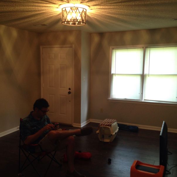 We brought our tv and a couple camp chairs just in case our furniture didn’t arrive right away. Now that our couch is here, it is oriented in much the same way (but the tv is on a stand and up against the wall, lol). I’ve chosen to use the space you see behind Chet as a sort of entryway.