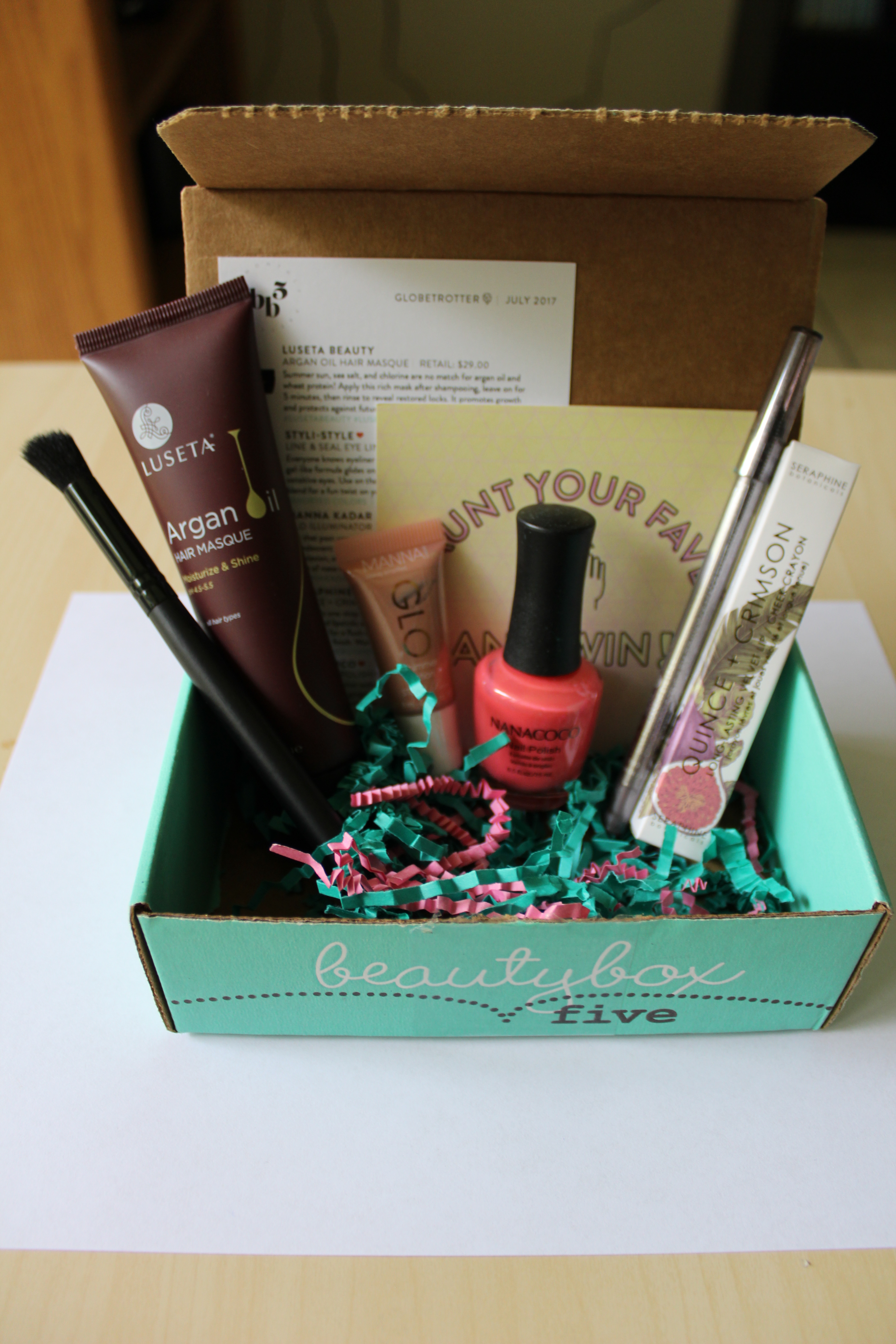Hi friends! I recently received another box from Beauty Box 5 and would love to share the contents, if you’re game. In case you missed previous posts, Beauty Box 5 is a subscription service that sends 5 new beauty products straight to your doorstep each month. And I know, I know. Today is the last day of August and this is my box from July but I actually didn’t receive it until this month (there were some shipping issues).