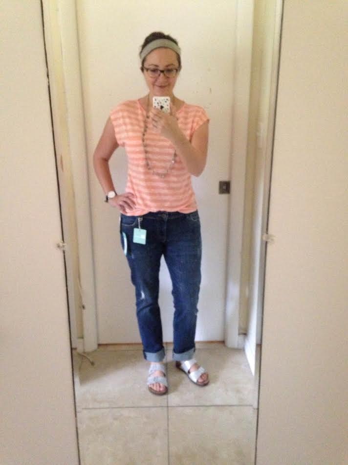 So I did get one short-sleeved top in this fix! The color is super cute, although not exactly seasonal, and the length was perfect for tucking in a pair of jeans or wearing loose with some smart shorts. This was the piece I debated for the longest. I did ask for it! But in the end, I decided the material was too sheer. I’m just not a huge fan of wearing camis/tanks under my tees.